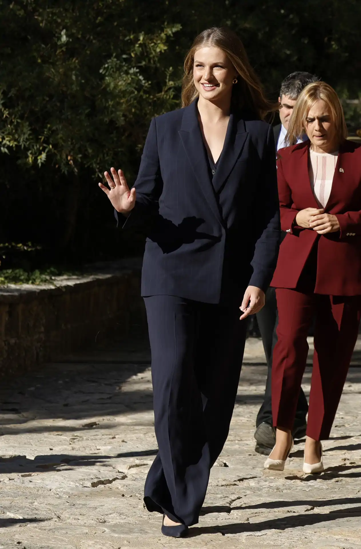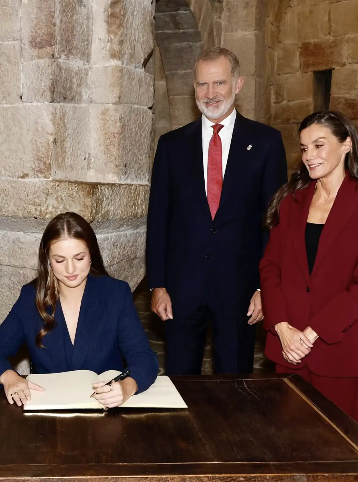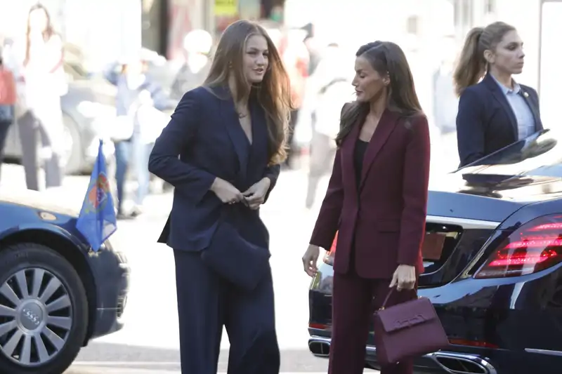 La heredera al trono se ha convertido en el centro de atención de todas las miradas con un traje de raya diplomática, mientras que la Reina Letizia ha seguido sus pasos con un traje de dos piezas, pero esta vez en color burdeos, el tono de la temporada por excelencia.